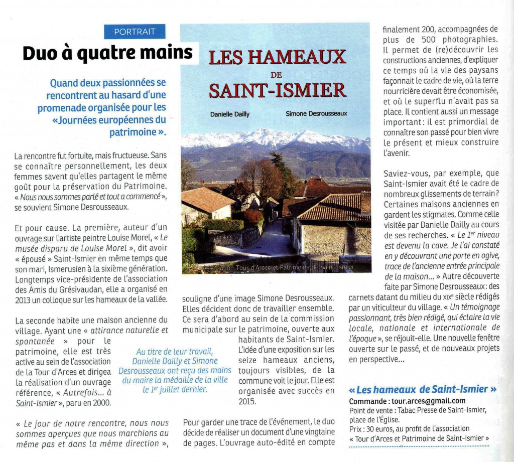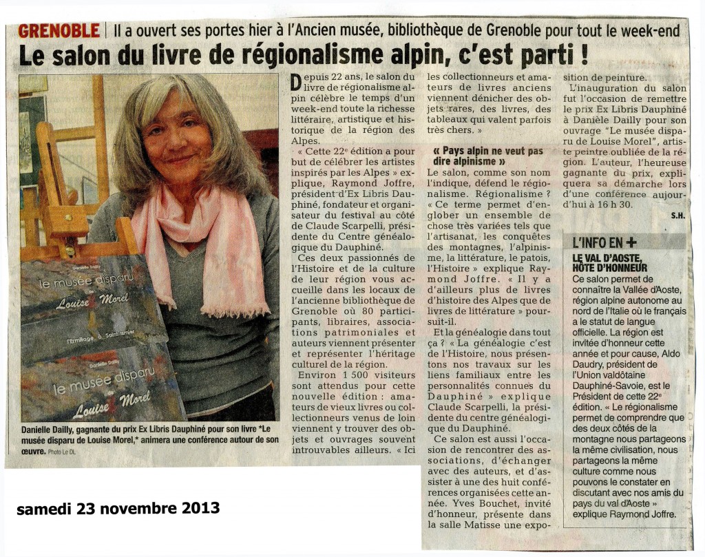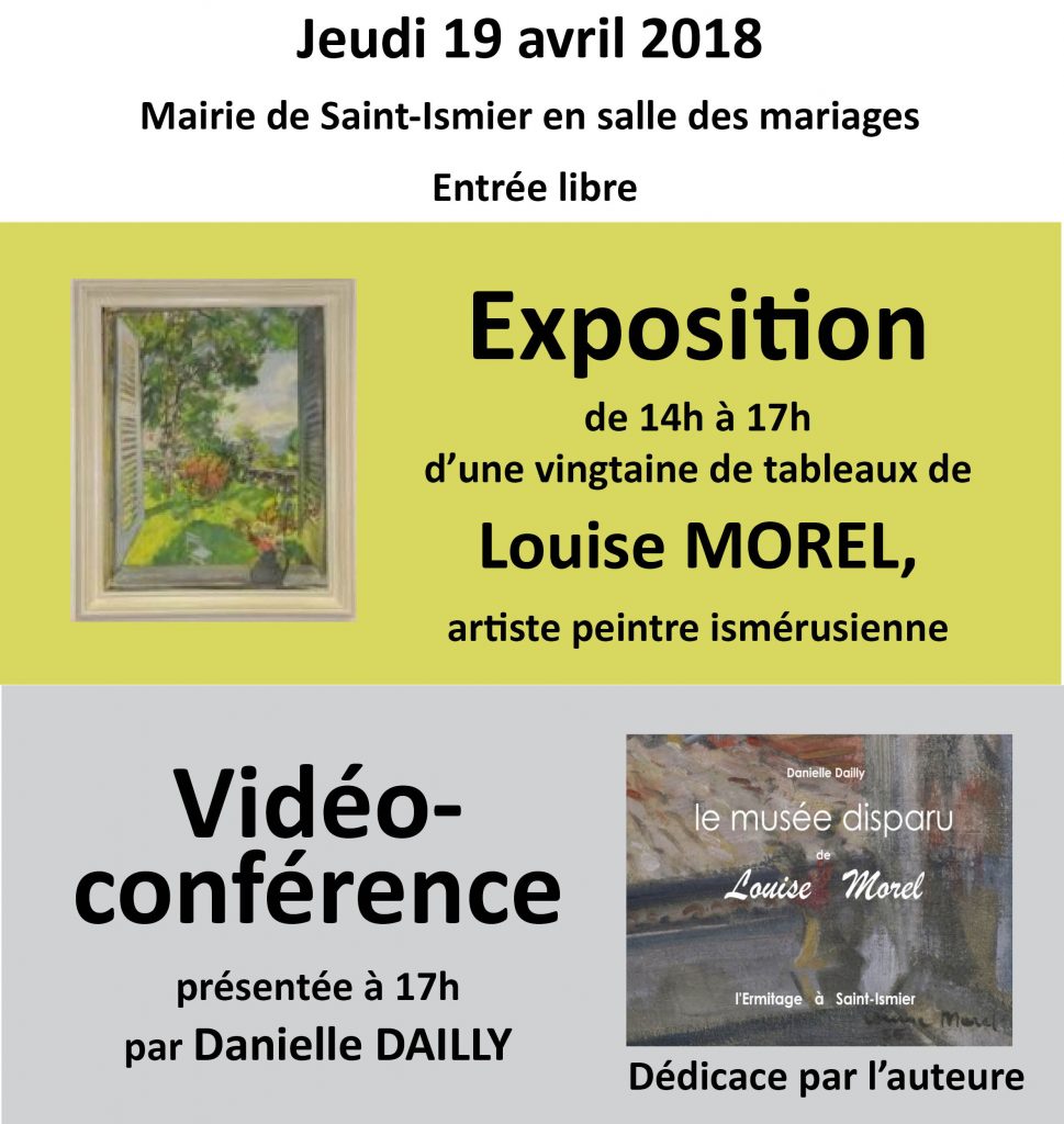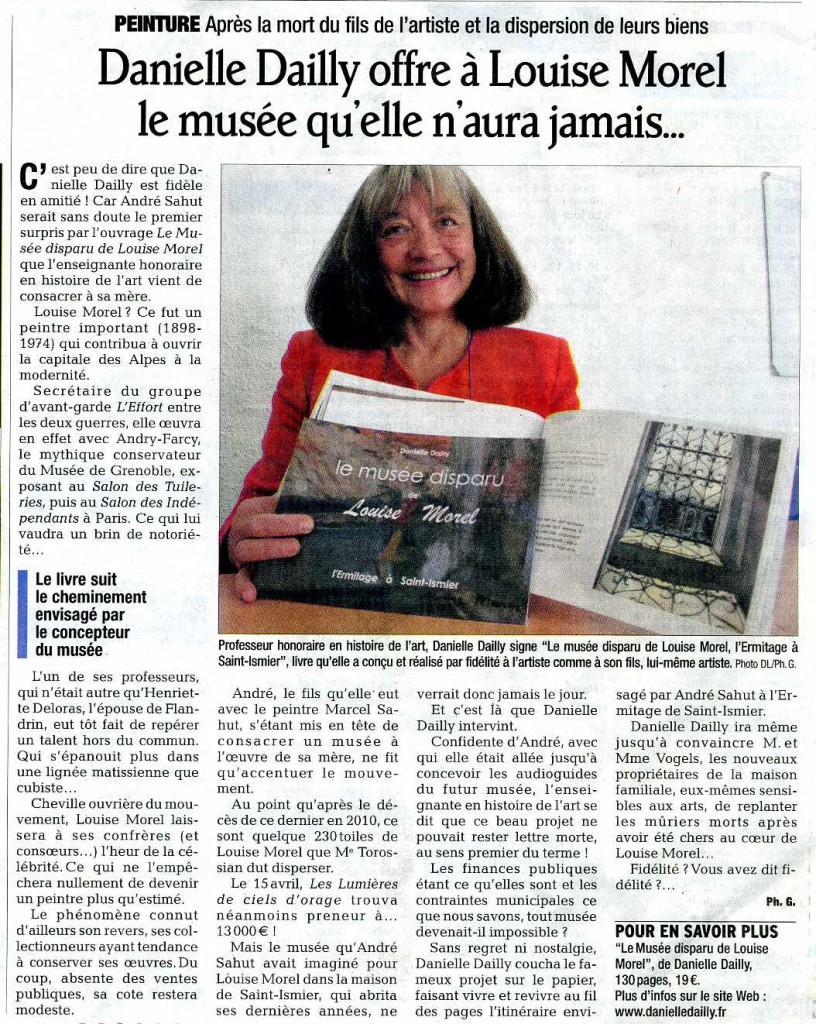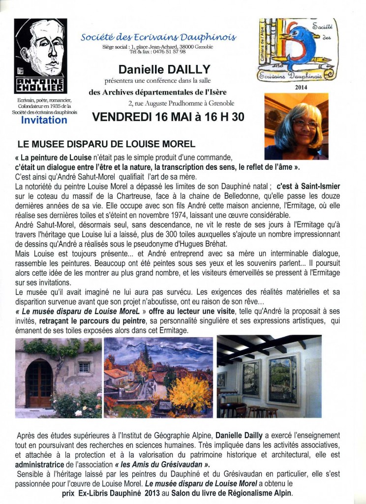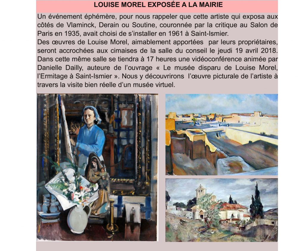 Une journée seulement, l’artiste revient orner les murs de sa commune. Aux cimaises de la salle du conseil de la mairie de Saint-Ismier : des fenêtres ouvertes sur la colline du Rabot et les forêts de Chartreuse, les oasis du sud tunisien et de Mauritanie, un jardin fleuri ou des natures mortes… Les propriétaires ont accroché leurs tableaux, comme pour laisser Louise Morel accompagner la conférencière. Danielle Dailly avait décrit le parcours, la personnalité et le talent de l’artiste au fil des pages du « Musée disparu de Louise Morel, l’Ermitage à Saint-Ismier ». Cette ardente passionnée de la sauvegarde du patrimoine, veut aujourd’hui faire perdurer la mémoire de Louise Morel, couronnée par la critique au salon de Paris en 1935 et qui avait choisi de s’installer en 1961 à Saint-Ismier.